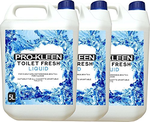 PRODUCT DESCRIPTIONS:Pro-Kleen for Caravans Motorhomes Boats brings products that are not only highly effective but also more cost effective 3 x 5 Litres concentrate Pro-Kleen Blue Toilet Fresh liquid Blue Toilet Fresh Liquid breaks down waste and creates a pleasant smell in the toilet compartment Pro-Kleen Blue Toilet Fresh concentrate Liquid is a powerful toilet fluid for daily use, breaking down wastes and controlling odours for up to five days per application. It's also non-drip, non-splash, and effective even after freezing and defrosting.