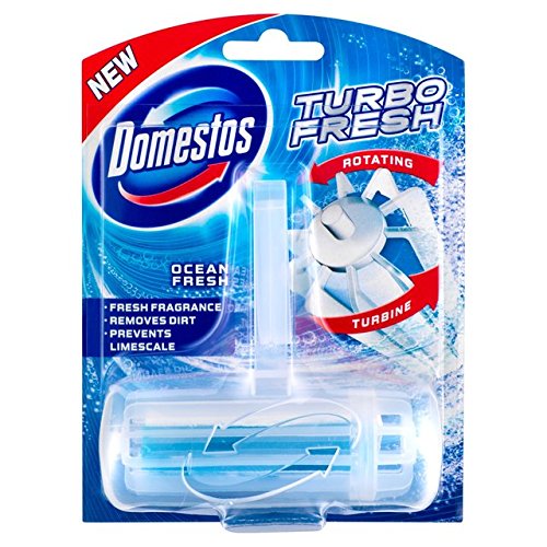 PRODUCT DESCRIPTIONS:Domestos Turbo Fresh is the only rotating toilet block with a two-phase refill that cleans and freshens with every flush.Its' turbine rotates under the pressure of water, spreading the Domestos cleaning power all around. Domestos Turbo Fresh prevents limescale and removes dirt where germs breed, while releasing fresh fragrance and a rich foam.An A.I.S.E. voluntary sustainability initiativewww.cleanright.eu