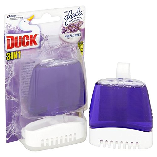 PRODUCT DESCRIPTIONS:Ensure your toilet remains spotless with Duck 3-in-1 Purple Wave. This block attaches easily to the rim of your toilet ensuring that a measured dose is distributed evenly around your toilet with each flush. Not only does our concentrated cleaning formula kill 99.9% of bacteria and keep your toilet smelling fresh, it also strips away limescale, to ensure that stains don't stick. Duck Liquid Rimblocks are available in starter or refill packs in several different fragrances.Installing Duck 3-in-1 Purple Wave couldn't be easier. Whilst holding over the toilet bowl, press the liquid bottle into the cage, ensuring that the bottle cap is fully pierced. Attach the cage to the rim of your toilet so that water flows through it each time you flush.Duck, an SC Johnson company, is at the forefront of cleaning innovations, providing your home with professional tools to help keep your bathroom clean, limescale free, and fresh. We understand how important it is to have a germ-free bathroom that's safe for the whole family and offer a variety of ways, from rim and in-cistern blocks, to disposable brushes and liquid cleaners, to ensure that all homes can enjoy the unique cleaning power of Duck. Our products are available in a number of fragrances across multiple product ranges to guarantee your bathroom is not only hygienic but smells great too. We are committed to health and environmental issues, and every one of our products are designed to meet, or exceed, governmental standards. Duck, providing cleaning products that make tough jobs easy.SC JohnsonA family company since 1886.Fisk JohnsonWith protective shield, New cleaning formula, Cleans with every flush, Prevents the build-up of limescale, Fragrances for up to 4 weeksWith glade fragranceCleans with every flushFights limescaleLong lasting freshnessDuck® Liquid Rimblock units and refills are available in a variety of fragrances.An A. I. S. E voluntary sustainability initiativewww.cleanright.eu