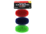 PRODUCT DESCRIPTIONS:Versatile and useful pack of 3 nylon scrub brushes are ideal for a number of household jobs. Each package includes a blue, a red and a green brush. They can be color coordinated to a specific job or a specific family member. Color of brush bristles matches color of brush itself. Comes packaged in a poly bag with header card. Each brush measures 3 3/4 quot; x 2 1/4 quot;.--15per pack